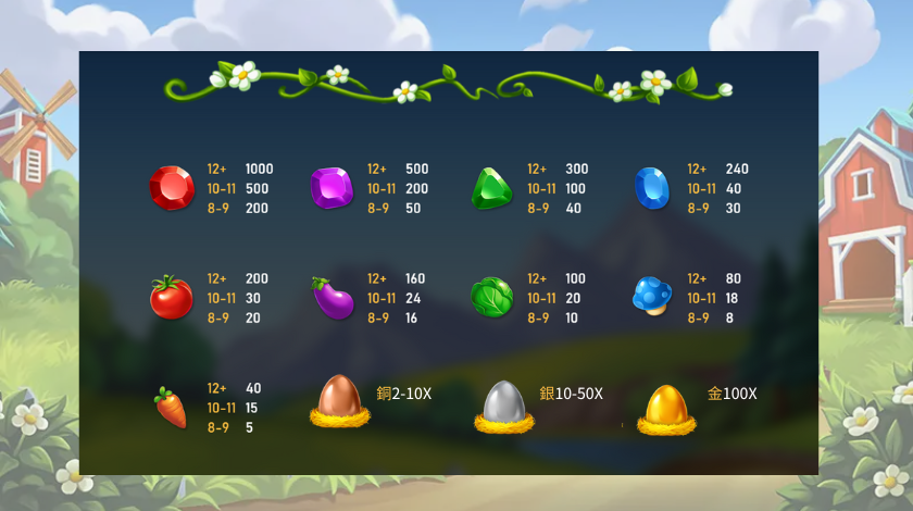 | 一般符號 | 農作物/工具類 | 根據連線數決定獎金(3個以上即可得分) |